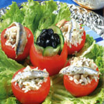 Laver les tomates, les couper en deux et les épépiner puis saler l'intérieur. Farcir chaque moitié de tomate avec le mélange de riz et de champignons. Décorer avec les filets d'anchois et les olives noires. Servir froid.
