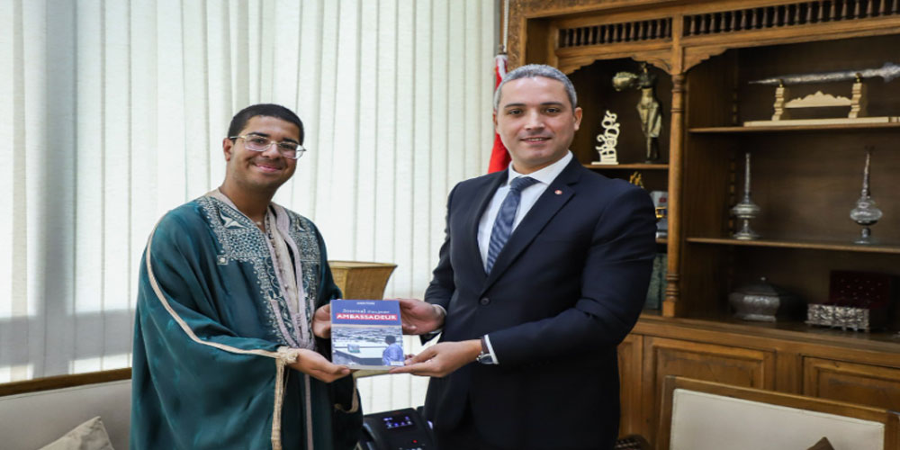وقدّم الشاب التونسي نسخة من كتابه الجديد"Journal d'un Jeune Ambassadeur" إلى وزير السياحة مشيرا إلى أنّه قد تمّ نشره في عدد من الدّول الأوربيّة والعربيّة وترجمته إلى عديد اللغات الأجنبيّة وإهدائه إلى عدد من رؤساء الدّول والحكومات حول العالم وهو مما سيساهم في مزيد التعريف بتونس.