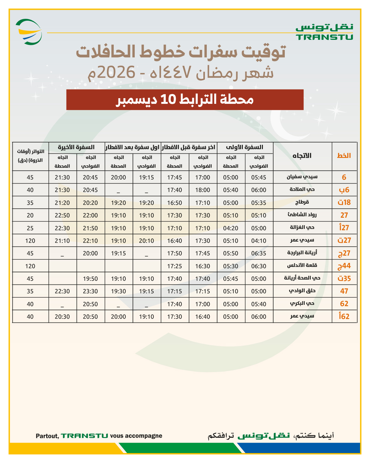 بمناسبة شهر رمضان، أعلنت شركة النقل العمومي عن توقيت السفرات الخاصة بالحافلات لتسهيل تنقلات المواطنين بين مختلف المحطات بالعاصمة وضواحيها.