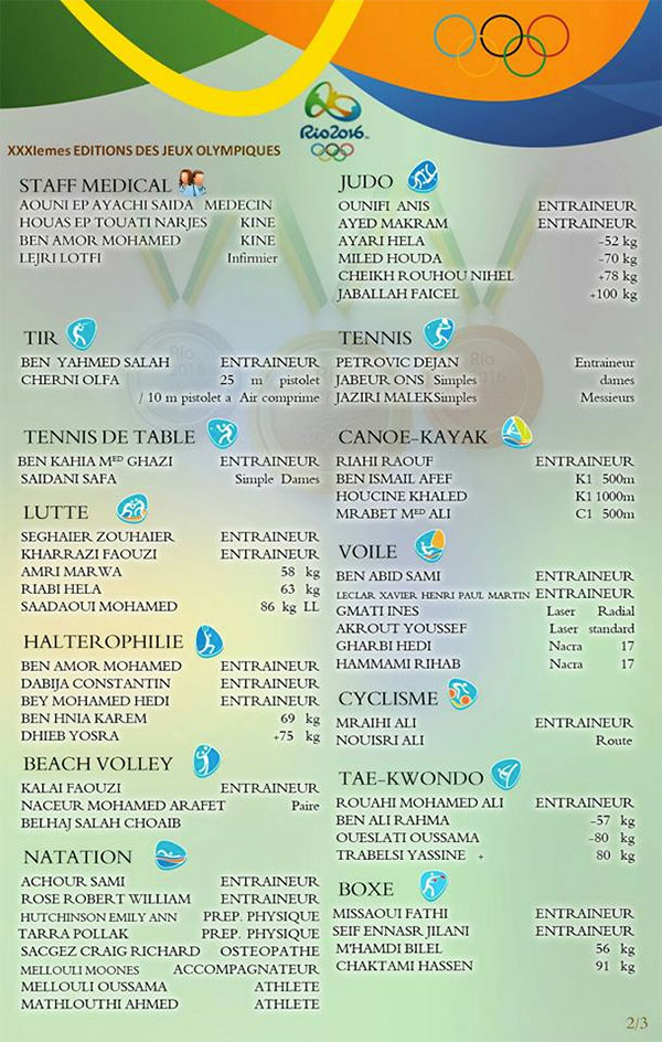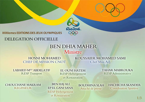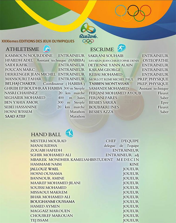Ci-joint la liste officielle de la délégation tunisienne à Rio de Janeiro 2016.
